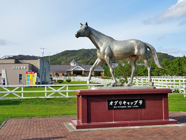新冠からサラブレッド銀座と呼ばれる道道209号線を進むと、左手に見えてくるのが優駿記念館とその前に立つオグリキャップの像。その奥に優駿スタリオンステーション(優駿SS)があります。